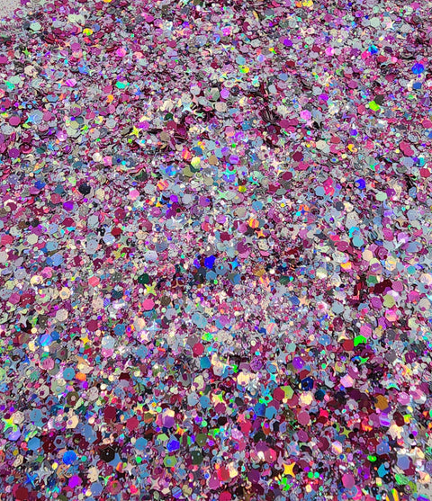 A custom mix of Opal, Pink and silver holographic, with 4 point stars chunky and fine mixed glitter.